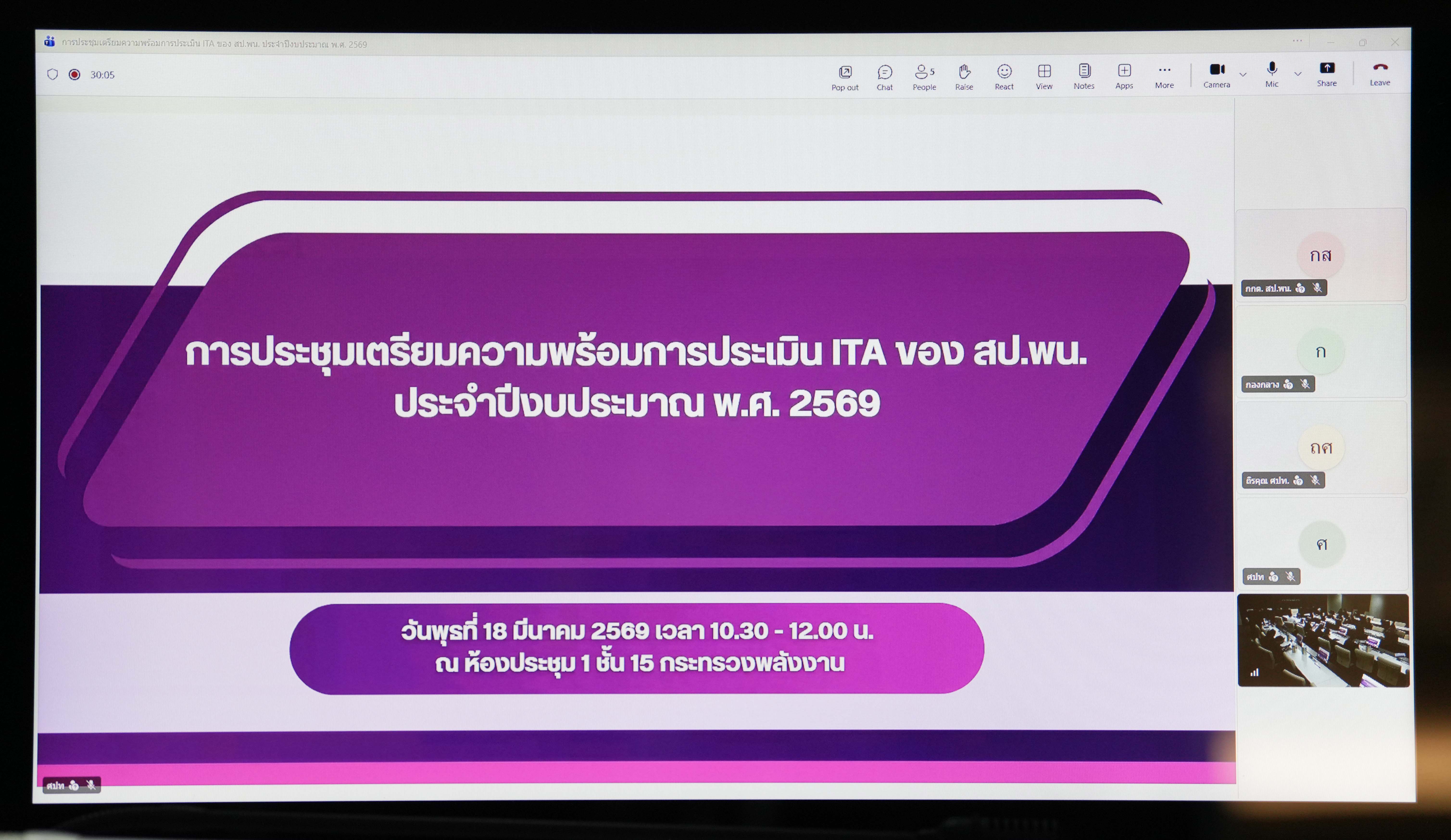 วันที่ 18 มีนาคม 2569 ณ ห้องประชุม 1 ชั้น 15 อาคารบี ศูนย์เอนเนอร์ยี่คอมเพล็กซ์ ศูนย์ปฏิบัติการต่อต้านการทุจริต กระทรวงพลังงาน (ศปท.พน.) จัดประชุมเตรียมความพร้อมการประเมินคุณธรรมและความ โปร่งใสในการดำเนินงานของหน่วยงานภาครัฐ (Integrity and Transparency Assessment: ITA) ของสำนักงานปลัดกระทรวงพลังงาน (สป.พน.) ประจำปีงบประมาณ พ.ศ. 2569 โดยมีนายวีรพัฒน์ เกียรติเฟื่องฟู รองปลัดกระทรวงพลังงานเป็นประธานการประชุม พร้อมด้วยผู้อำนวยการและผู้แทนจากทุกหน่วยงานในสังกัดเข้าร่วมทั้งในรูปแบบออนไซต์และออนไลน์