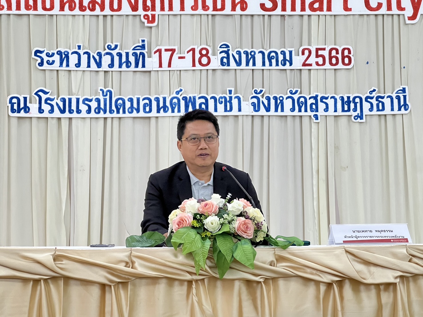 (Smart Energy) ของจังหวัดสุราษฎร์ธานี บุคลากรจากส่วนราชการในพื้นที่เทศบาลนครสุราษฎร์ธานี บุคลากรจากกระทรวงพลังงาน ทั้งส่วนกลางและส่วนภูมิภาค รวมกว่า 100 ท่าน และหวังว่าการจัดสัมมนาในครั้งนี้ จะเป็นจุดเริ่มต้นและนำไปบริหารจัดการด้านพลังงานเพื่อพัฒนาสู่ Smart City ในจังหวัดอื่นๆ ต่อไปนายเพทายกล่าว