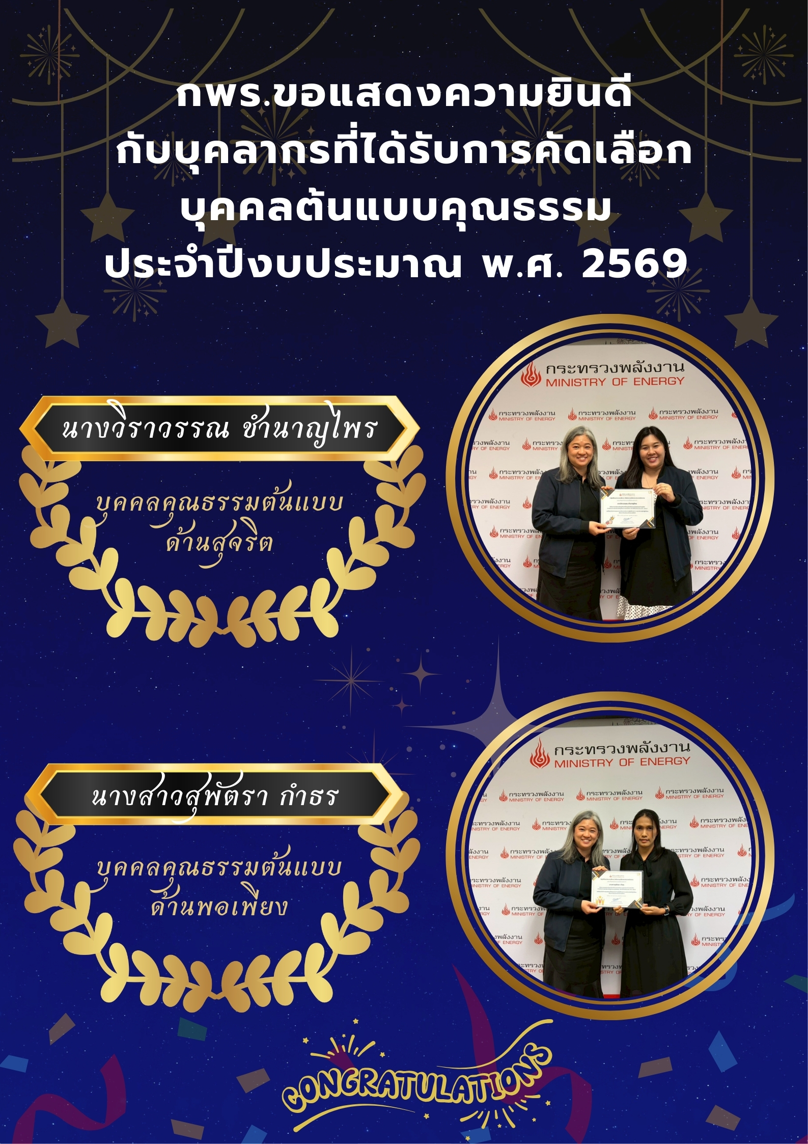 กพร. สป.พน. จัดกิจกรรมยกย่องเชิดชูบุคคลและหน่วยงานต้นแบบคุณธรรม ประจำปีงบประมาณ พ.ศ. 2569 โดยมี นางสาวอโณทัย วีระสกุล หัวหน้ากลุ่มพัฒนาระบบบริหาร ได้มอบเกียรติบัตรยกย่องเชิดชูเกียรติบุคคลและหน่วยงานคุณธรรมต้นแบบ ประจำปีงบประมาณ พ.ศ. 2569 ดังนี้