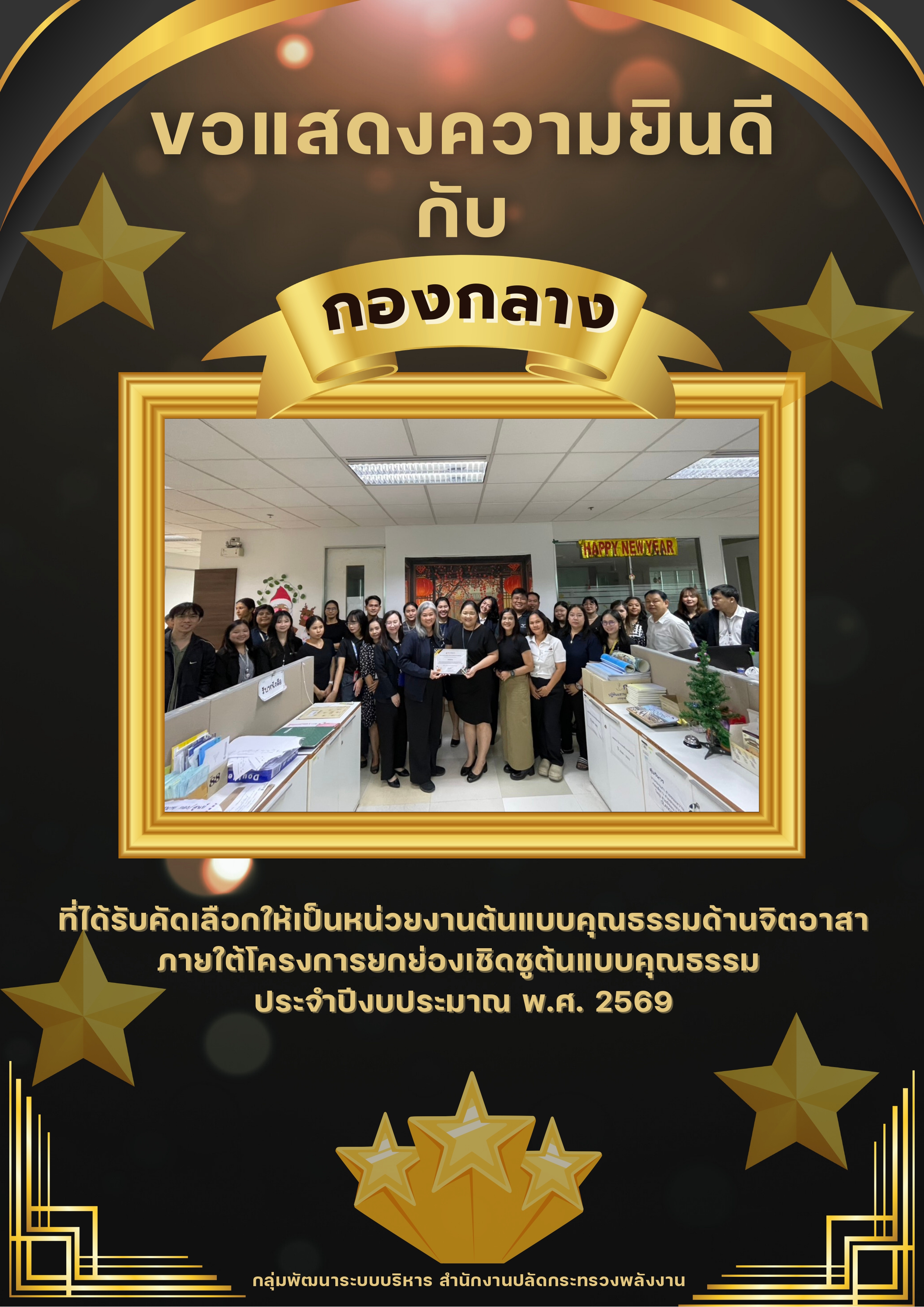 - กองกลาง ได้รับการคัดเลือกเป็นหน่วยงานคุณธรรมต้นแบบ “ด้านจิตอาสา" ประจำปีงบประมาณ พ.ศ. 2569 เป็นหน่วยงานที่มีกิจกรรมจิตอาสาอย่างต่อเนื่องและเป็นแบบอย่างที่ดีให้กับหน่วยงานอื่นๆ