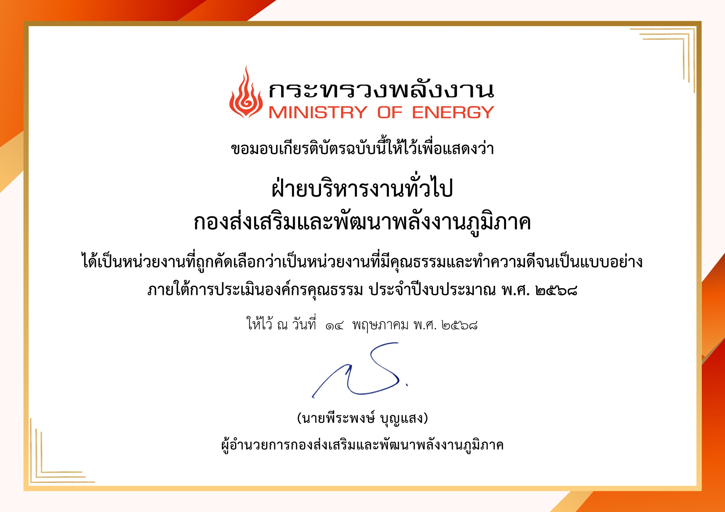 กองส่งเสริมและพัฒนาพลังงานภูมิภาค มอบเกียรติบัตรให้กับหน่วยงาน และบุคคลผู้มีคุณธรรมและทำความดี